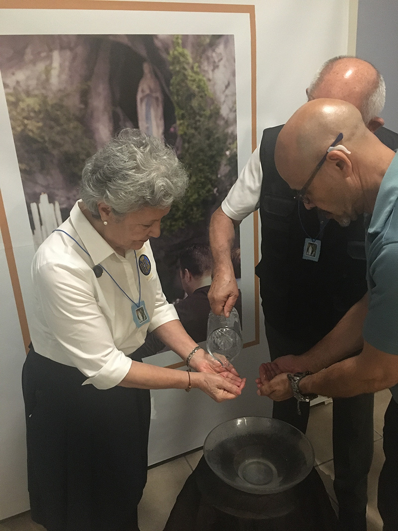 The pilgrims are guided by a priest or a hospitalier, they approach the designated fountains near the Grotto, reflecting on personal intentions for healing and grace. Follows a prayer to Our Lady of Lourdes. - Washing: